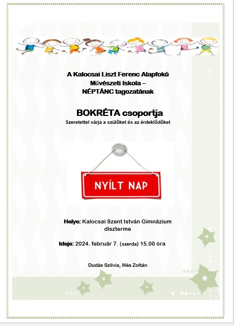 Köszönjük a Kóka néptáncegyüttes meghívását 2024. 04. 27-én megrendezésre kerülő "Ez a kicsi mulatság" c. műsorára, ahol egyesületünk Bokréta csoportja két koreográfiával és a Csajgorás csoport 3 párja mutatkozott be kalocsai táncokkal. párja mutatkozott be kalocsai táncokkal.